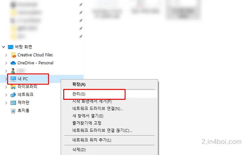 그래픽카드나 저장장치 등 상세한 정보는 [내 PC] > [마우스 우측버튼] > [관리]를 선택합니다.